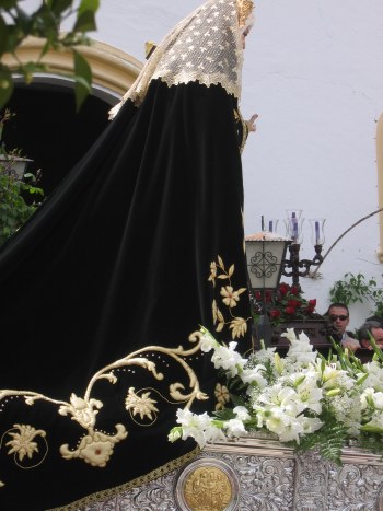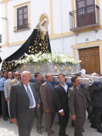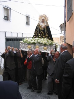 A continuación, sobre un trono finamente cincelado y ricamente decorado, de metal plateado y dorado, procedente de los talleres de orfebrería Angulo de Lucena, lo hace María Santísima de los Dolores. Imagen que acompaña al Nazareno durante todo su recorrido, a excepción de un pequeño tramo por la calle Fuente Tójar en el que se procesiona sola, hasta que sale a su encuentro en la calle Horno. Siendo este, uno de los momentos mas emotivos de la Semana Santa Campeña, ya que los costaleros acercan e inclinan las andas para que la desconsolada Madre despida a su martirizado Hijo, antes de subir al Calvario.